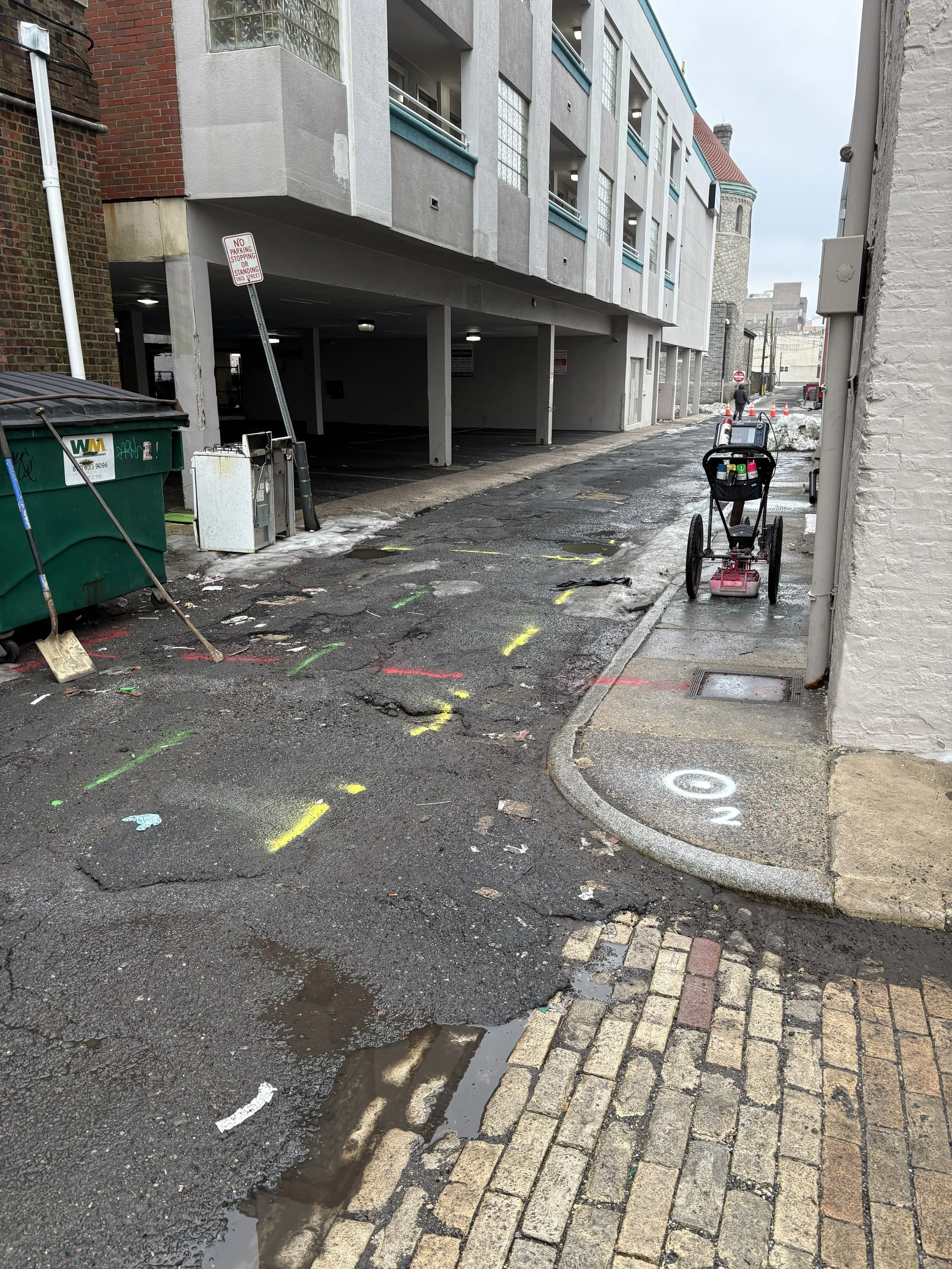 No slot machines for me, but I did take my chances in a slightly dicey alleyway. I was tasked with locating buried utilities within the alley. Gas, electric, water, and sanitary sewer lines were all present - all the modern conveniences we use every day but rarely think about because it’s out of sight.