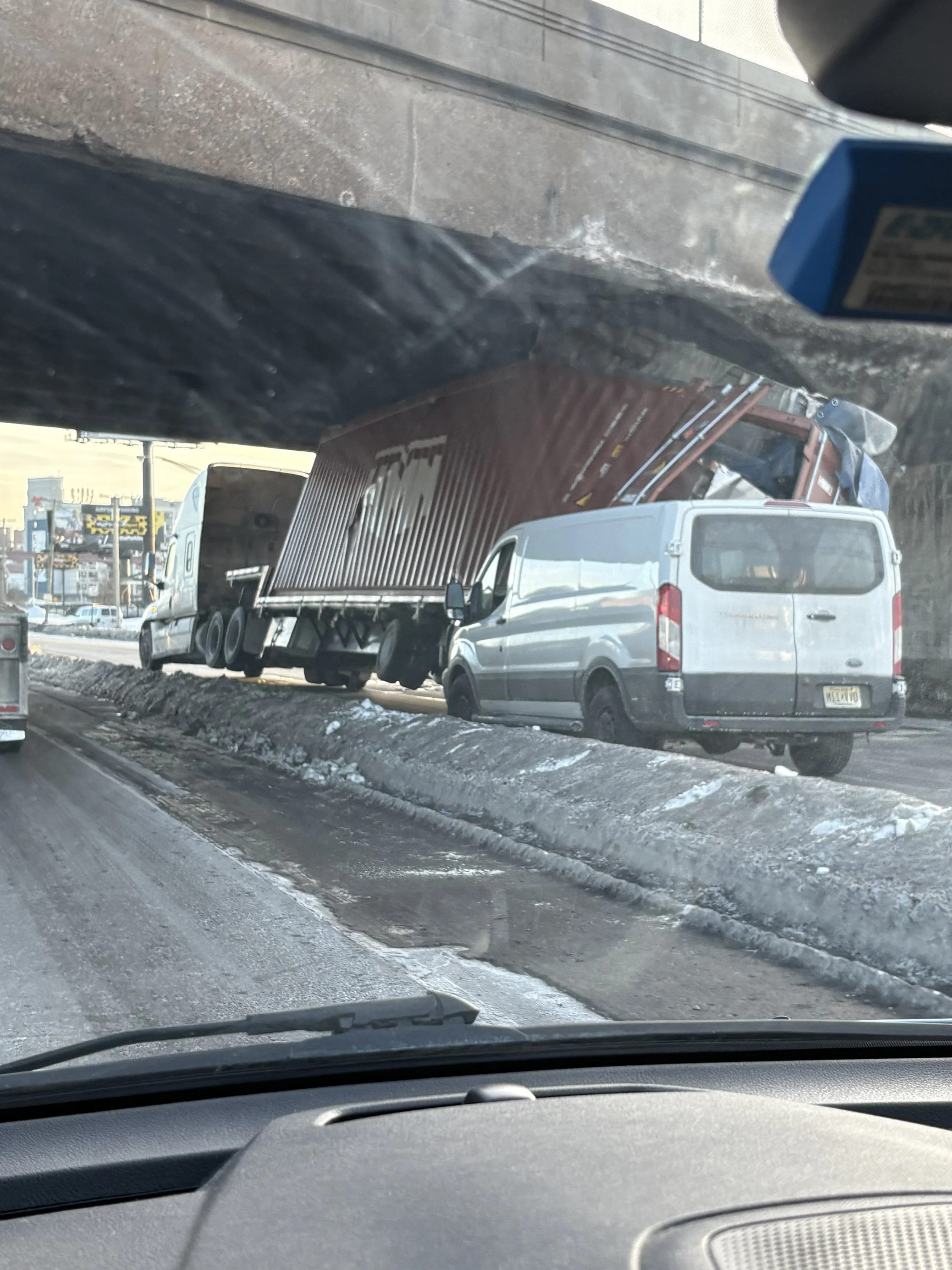On my way home from Jersey City, I hit unusually heavy traffic just outside Newark Airport. The culprit? A truck wedged beneath an overpass! Through all my years of driving, this is something I’ve never seen in person. Thankfully no sign of serious injuries.